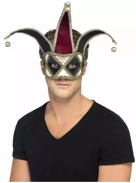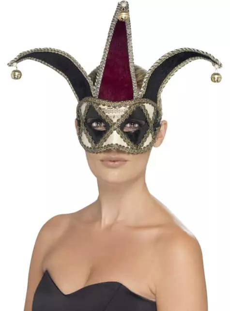 Incluye un antifaz de arlequín veneciano gótico de color blanco y negro, con detalles en tonalidad oro y, en la parte superior, tres extensiones triangulares con cascabeles en sus vértices.