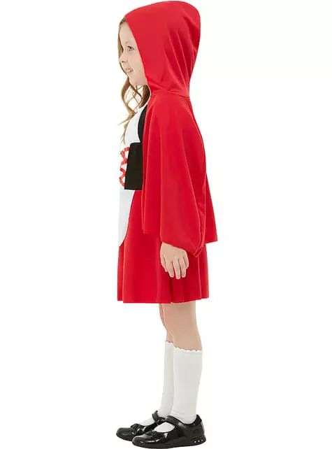 Este traje de caperucita roja se compone de un vestido y una capa, ambos de color rojo. El frontal del vestido es blanco y con tiras negras, típico del estilo tirolés con el que vestía este personaje. La capa además lleva capucha, ¡igual que la de Caperucita!