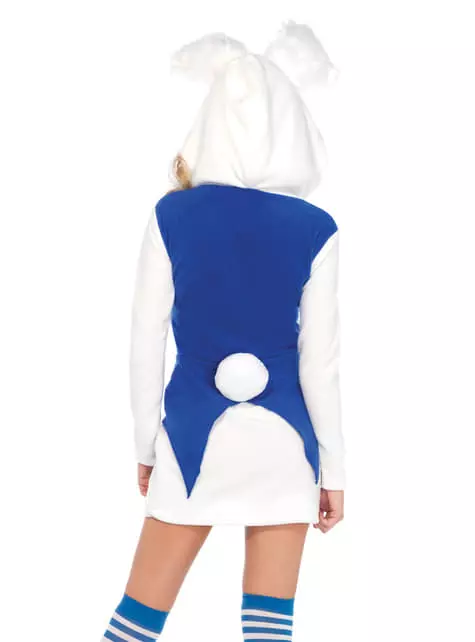 Incluye vestido de felpa con cremallera frontal capuchón con orejas y cola, pajarita de lunares y reloj de bolsillo.