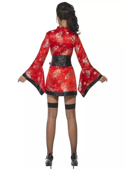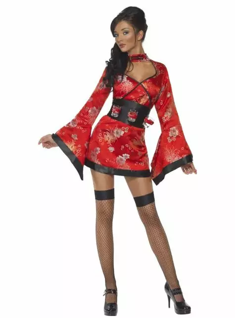 Incluye un minivestido de geisha de color rojo con un original cinturón con soporte para vasos de chupito.