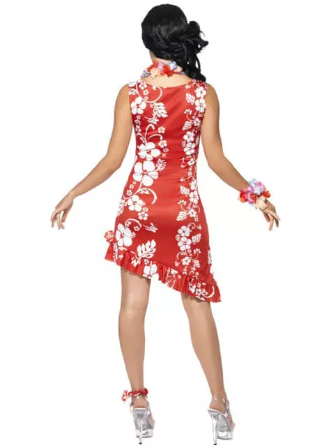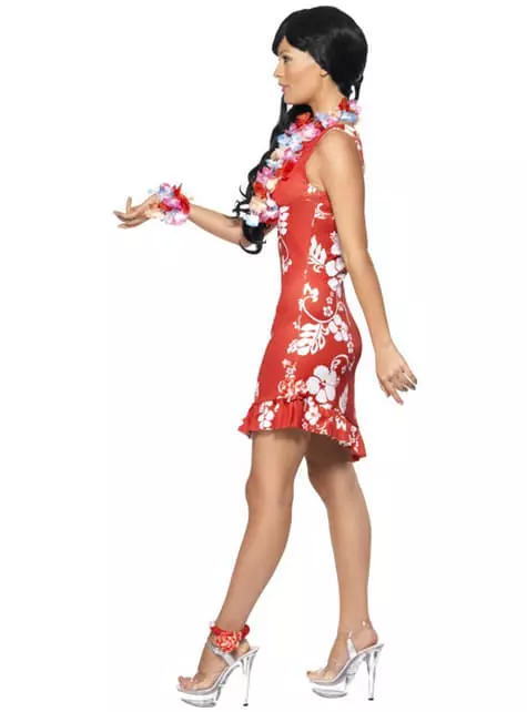 Este atractivo disfraz incluye un vestido estampado rojo con flores blancas, junto con un adorno para el pelo y una tobillera a juego.
