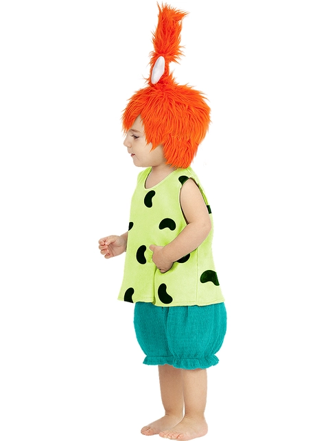 Este vestido de Pebbles para bebé cuenta con todos los detalles que le hacen ser idéntico al atuendo de la pequeña de la familia Picapiedra. El disfraz de Pebbles se compone de una camiseta verde sin mangas con manchitas negras en forma de cacahuete y un pantalón corto azul claro. Todo muy cómodo para que tu pequeña se pueda mover con soltura. Además, incorpora una peluca naranja con flequillo y moño, aguantado por un hueso, de la pequeña Pebbles.