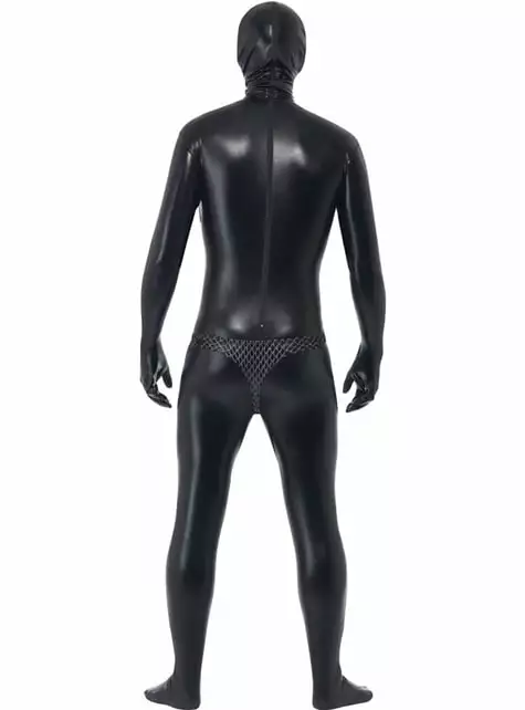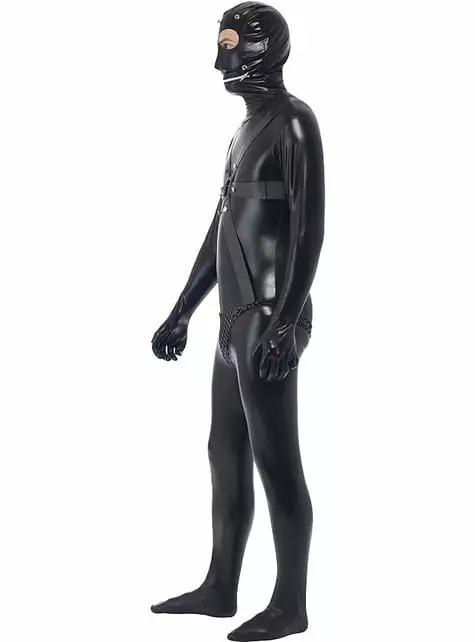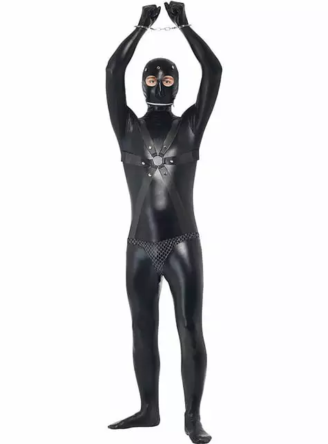 Este sumiso disfraz de sado incluye un mono negro ajustado con correas en el cuerpo y cota de malla incorporada.
