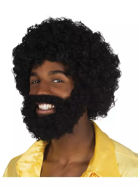 Incluye un kit con una peluca corta y rizada color negro y una barba color negro.